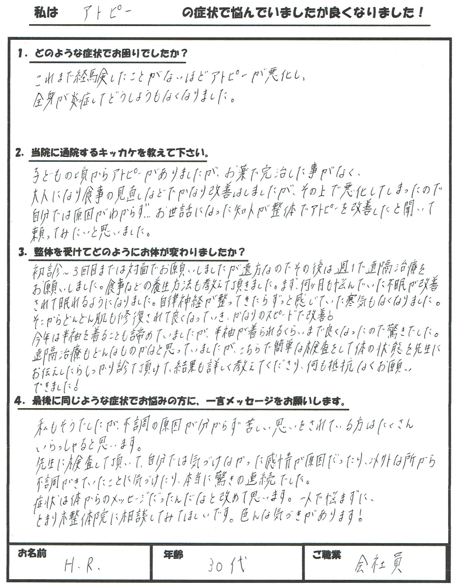 子どもの頃からアトピーがありましたが、お薬で完治したことがなく、大人になり食事の見直しなどでかなり改善しましたが、その上で悪化してしまったので、自分では原因が分からず、お世話になった知人が整体でアトピーが改善したと聞いて頼ってみたいと思いました。